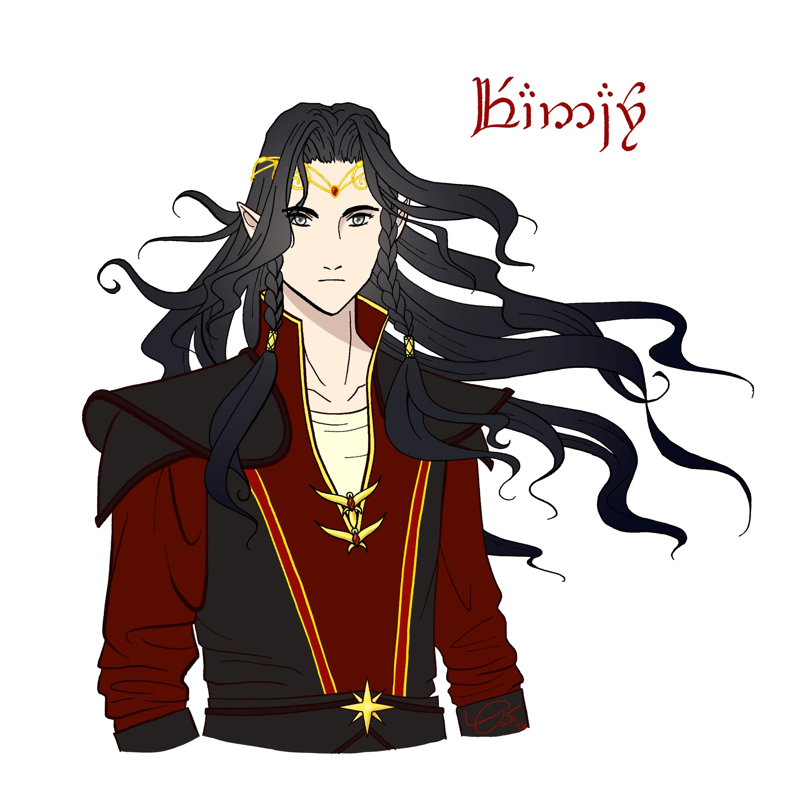 Fëanor, drawn by me, wiþ his name in Quenya. What even is Years of þe Trees fashion? Don’t @ me.